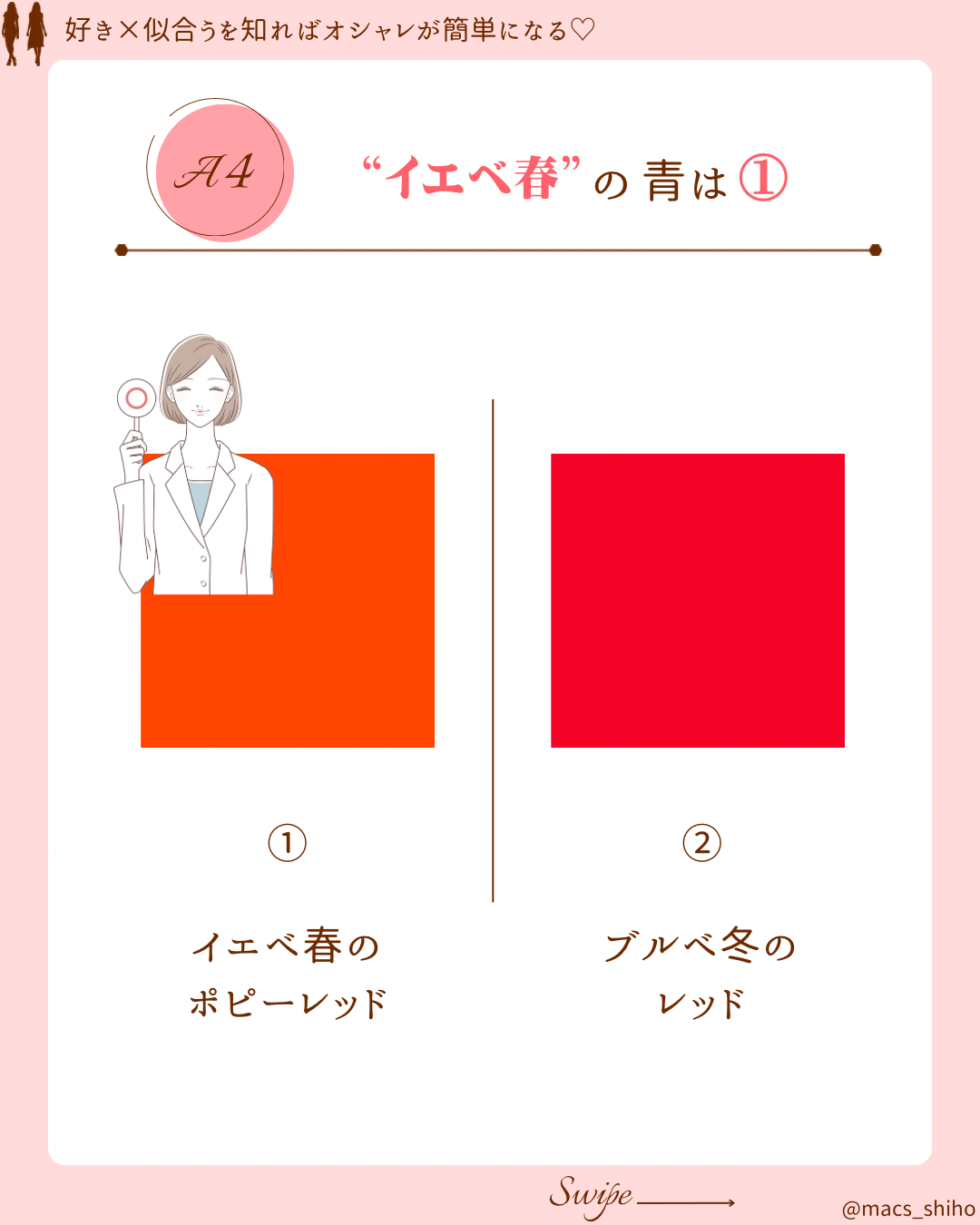 イエベ春とブルベ冬は、どちらも鮮やかな色が特徴ですが、その印象はまったく違います。