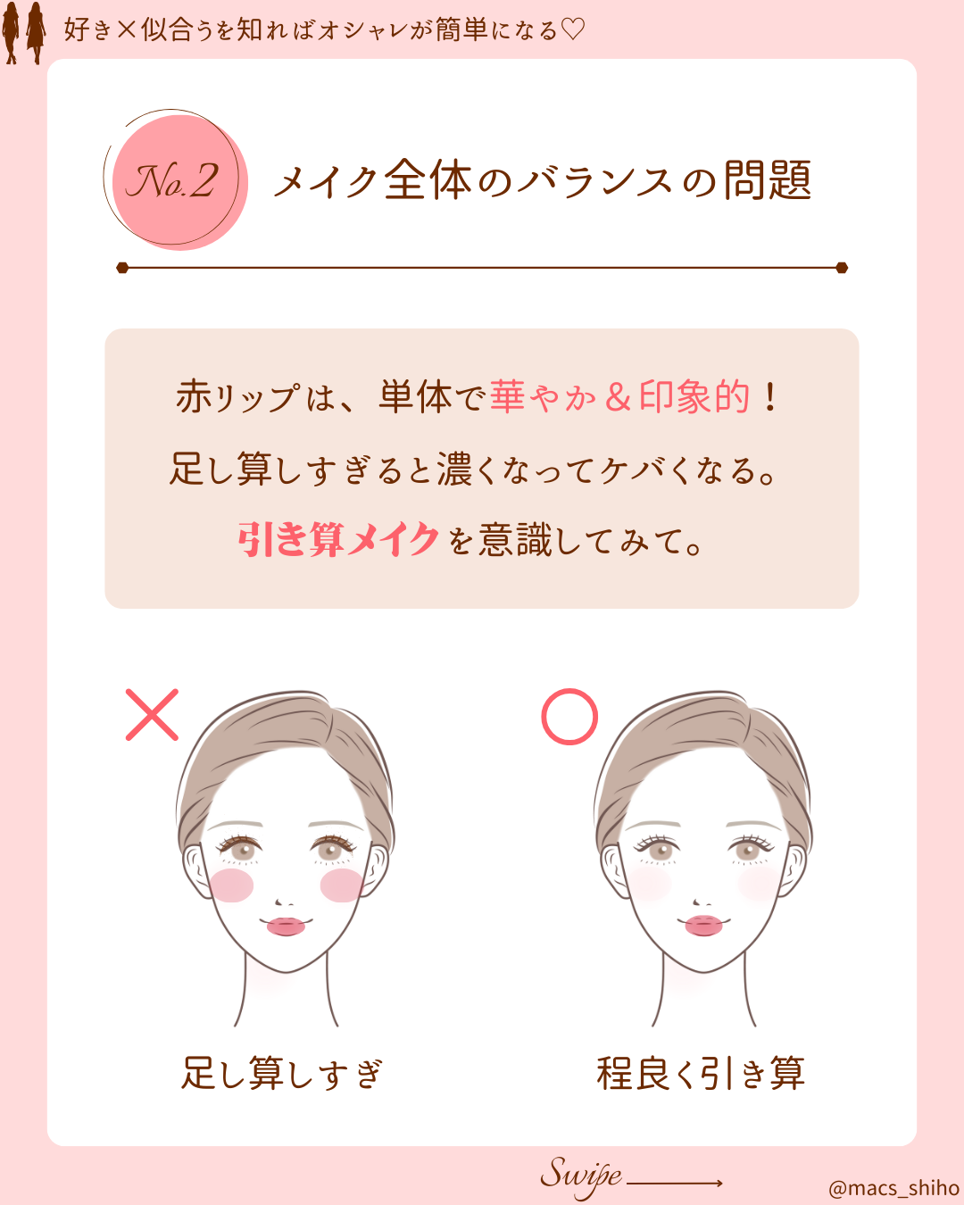 - ○ ②メイク全体のバランスも大事!赤リップ主役の“引き算メイク”を意識して