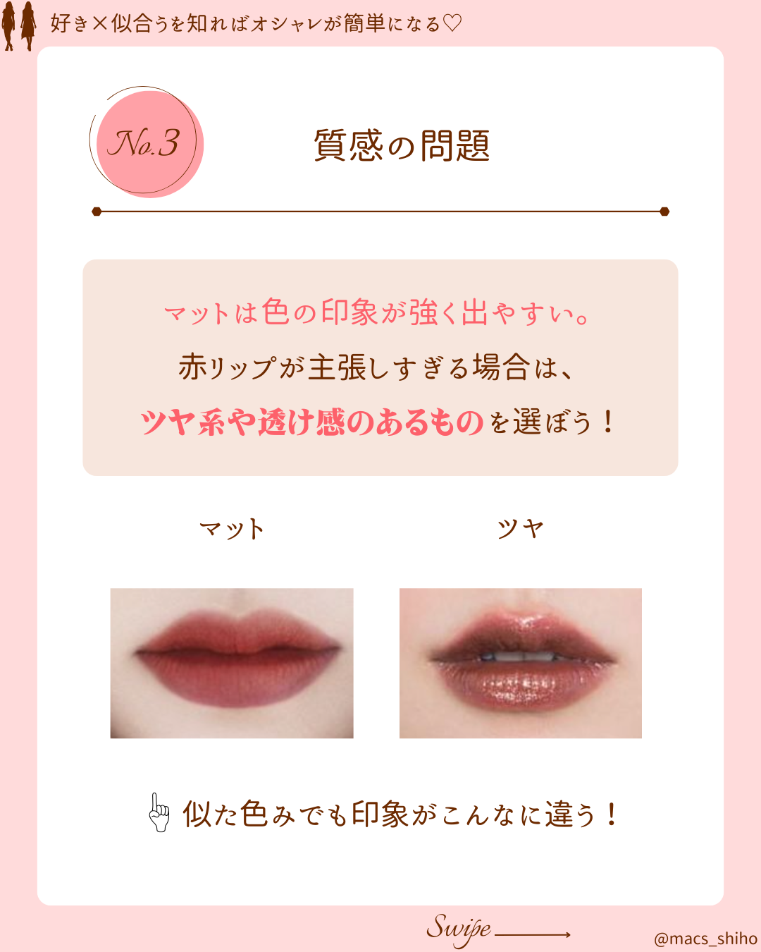 - ○ ③同じ赤でも印象が変わる!質感選びにも注目してみて