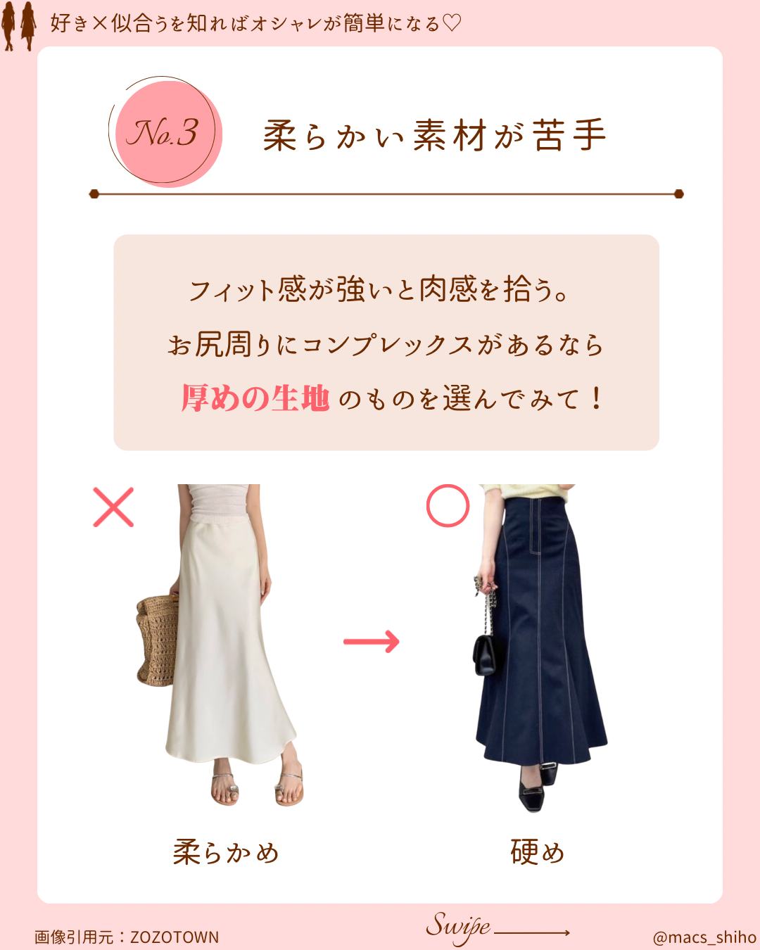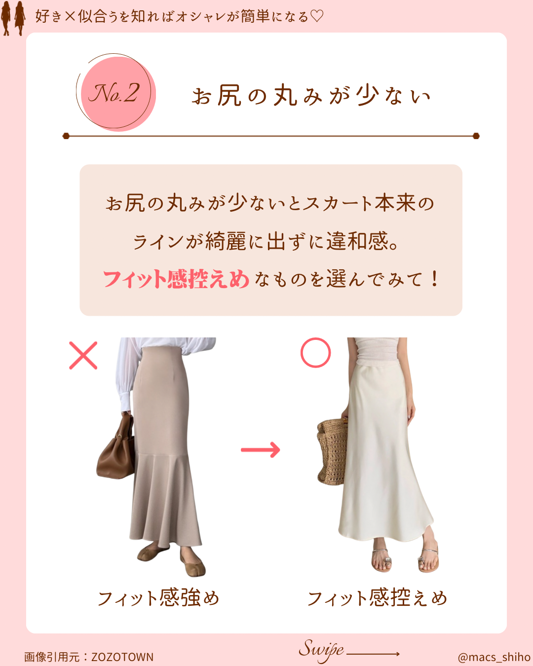 - ○ ② お尻の丸みが少ないタイプは“フィット控えめ”が正解!