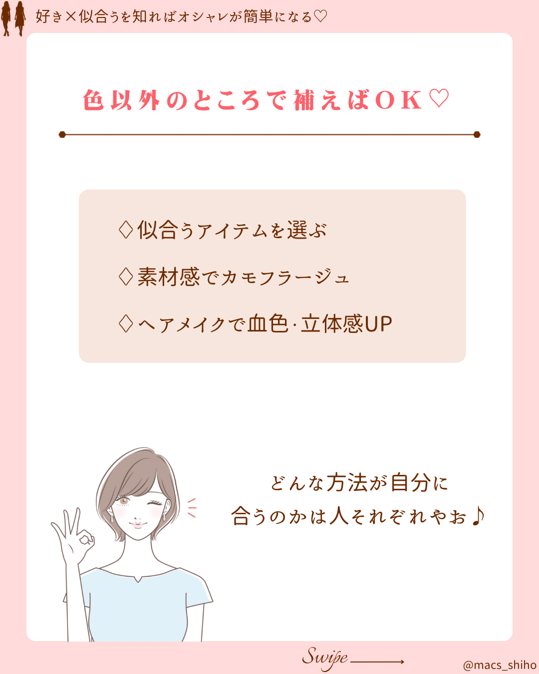 - ○ 色以外でカバーする方法も!素材・デザイン・メイクで似合わせる