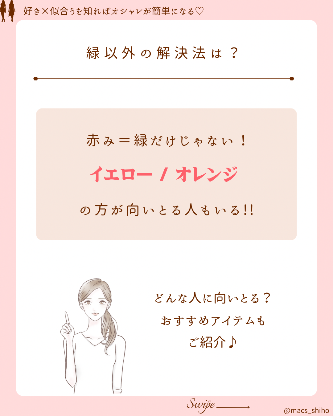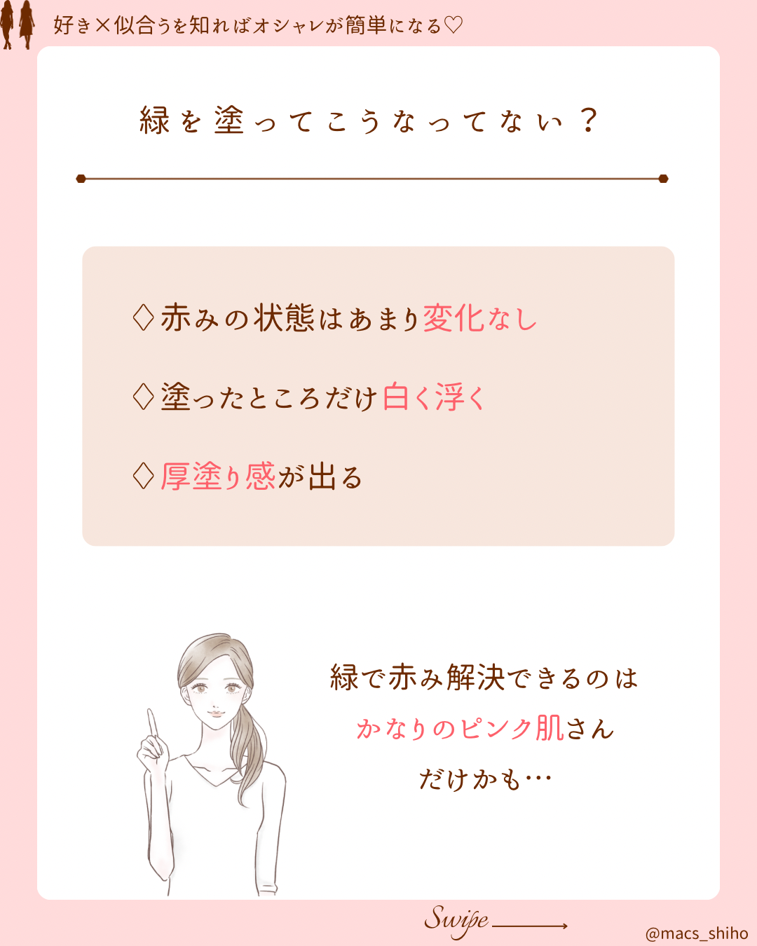 - ○ 実は!赤み=緑じゃない!他の色の方が合う人もいる